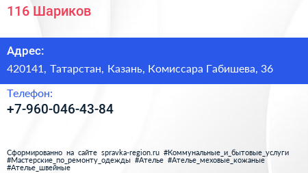 116 Шариков по адресу 420141, Татарстан, Казань, Комиссара Габишева, 36 в дальнейшем Организация, размещена в следующих категориях: