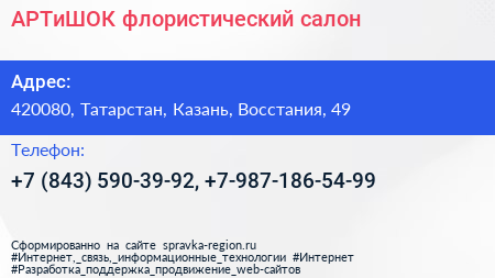 АРТиШОК, флористический салон по адресу 420080, Татарстан, Казань, Восстания, 49 в дальнейшем Организация, размещена в следующих категориях: