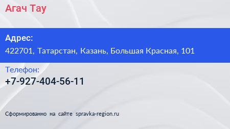 Агач Тау по адресу 422701, Татарстан, Казань, Большая Красная, 101 в дальнейшем Организация, размещена в следующих категориях: