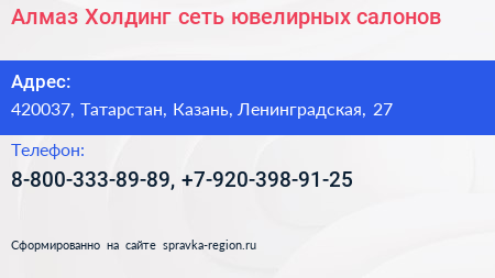 Алмаз-Холдинг, сеть ювелирных салонов по адресу 420037, Татарстан, Казань, Ленинградская, 27 в дальнейшем Организация, размещена в следующих категориях: