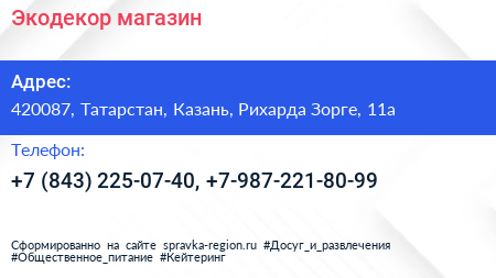 Экодекор, магазин по адресу 420087, Татарстан, Казань, Рихарда Зорге, 11а в дальнейшем Организация, размещена в следующих категориях:
