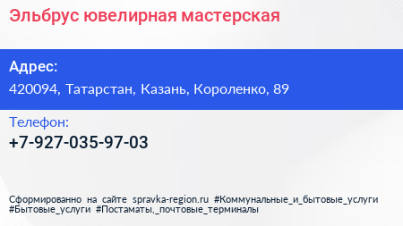 Эльбрус, ювелирная мастерская по адресу 420094, Татарстан, Казань, Короленко, 89 в дальнейшем Организация, размещена в следующих категориях: