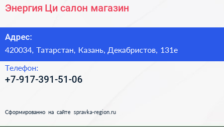 Энергия Ци, салон-магазин по адресу 420034, Татарстан, Казань, Декабристов, 131е в дальнейшем Организация, размещена в следующих категориях: