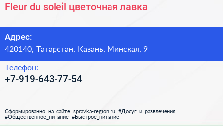 Fleur du soleil, цветочная лавка по адресу 420140, Татарстан, Казань, Минская, 9 в дальнейшем Организация, размещена в следующих категориях: