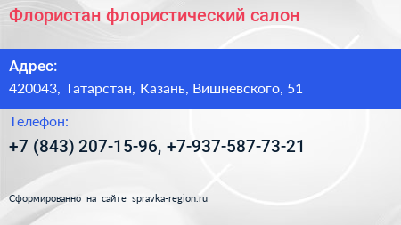 Флористан, флористический салон по адресу 420043, Татарстан, Казань, Вишневского, 51 в дальнейшем Организация, размещена в следующих категориях: