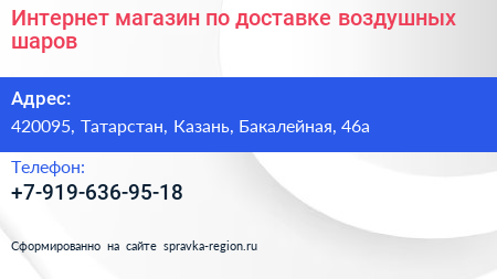 Интернет-магазин по доставке воздушных шаров по адресу 420095, Татарстан, Казань, Бакалейная, 46а в дальнейшем Организация, размещена в следующих категориях: