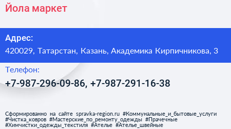 Йола-маркет по адресу 420029, Татарстан, Казань, Академика Кирпичникова, 3 в дальнейшем Организация, размещена в следующих категориях: