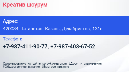 Креатив, шоурум по адресу 420034, Татарстан, Казань, Декабристов, 131е в дальнейшем Организация, размещена в следующих категориях: