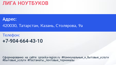 ЛИГА НОУТБУКОВ по адресу 420030, Татарстан, Казань, Столярова, 9а в дальнейшем Организация, размещена в следующих категориях: