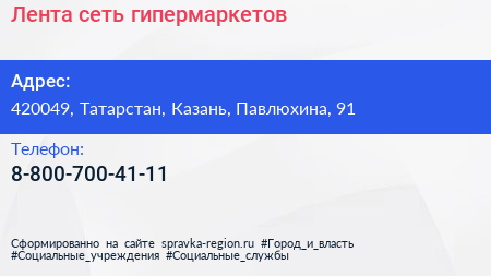Лента, сеть гипермаркетов по адресу 420049, Татарстан, Казань, Павлюхина, 91 в дальнейшем Организация, размещена в следующих категориях: