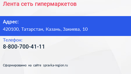 Лента, сеть гипермаркетов по адресу 420100, Татарстан, Казань, Закиева, 10 в дальнейшем Организация, размещена в следующих категориях: