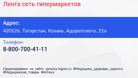 Лента, сеть гипермаркетов по адресу 420126, Татарстан, Казань, Адоратского, 21а в дальнейшем Организация, размещена в следующих категориях: