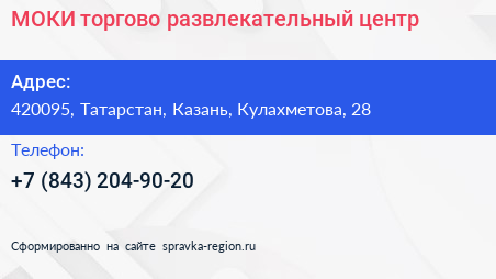 МОКИ, торгово-развлекательный центр по адресу 420095, Татарстан, Казань, Кулахметова, 28 в дальнейшем Организация, размещена в следующих категориях:
