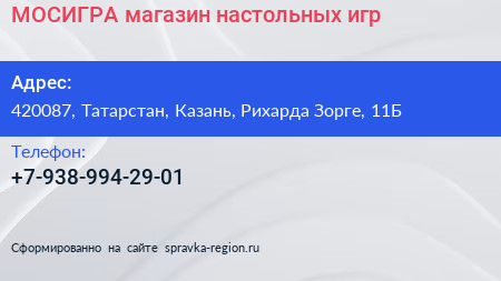 МОСИГРА, магазин настольных игр по адресу 420087, Татарстан, Казань, Рихарда Зорге, 11Б в дальнейшем Организация, размещена в следующих категориях: