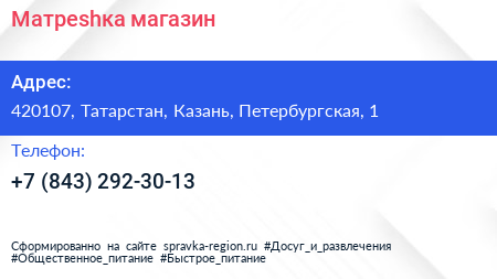 Матреshка, магазин по адресу 420107, Татарстан, Казань, Петербургская, 1 в дальнейшем Организация, размещена в следующих категориях: