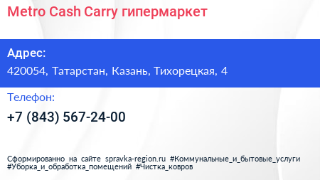 Metro Cash & Carry, гипермаркет по адресу 420054, Татарстан, Казань, Тихорецкая, 4 в дальнейшем Организация, размещена в следующих категориях: