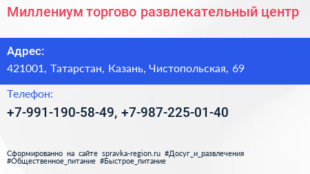 Миллениум, торгово-развлекательный центр по адресу 421001, Татарстан, Казань, Чистопольская, 69 в дальнейшем Организация, размещена в следующих категориях: