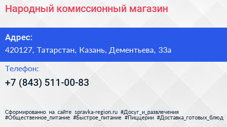 Народный, комиссионный магазин по адресу 420127, Татарстан, Казань, Дементьева, 33а в дальнейшем Организация, размещена в следующих категориях: