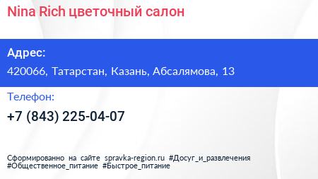 Nina Rich, цветочный салон по адресу 420066, Татарстан, Казань, Абсалямова, 13 в дальнейшем Организация, размещена в следующих категориях: