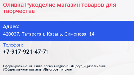 Оливка Рукоделие, магазин товаров для творчества по адресу 420037, Татарстан, Казань, Симонова, 14 в дальнейшем Организация, размещена в следующих категориях: