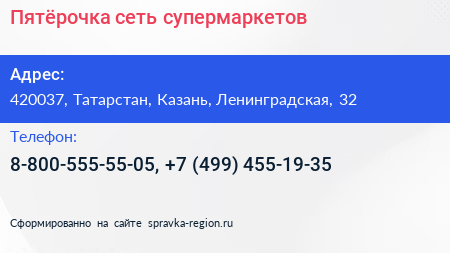 Пятёрочка, сеть супермаркетов по адресу 420037, Татарстан, Казань, Ленинградская, 32 в дальнейшем Организация, размещена в следующих категориях: