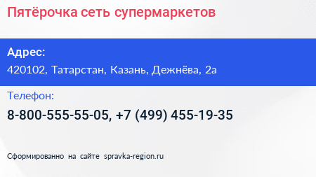 Пятёрочка, сеть супермаркетов по адресу 420102, Татарстан, Казань, Дежнёва, 2а в дальнейшем Организация, размещена в следующих категориях: