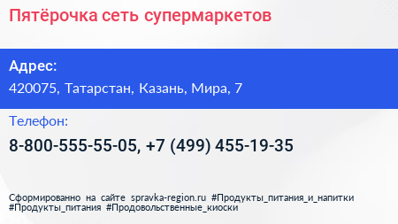 Пятёрочка, сеть супермаркетов по адресу 420075, Татарстан, Казань, Мира, 7 в дальнейшем Организация, размещена в следующих категориях: