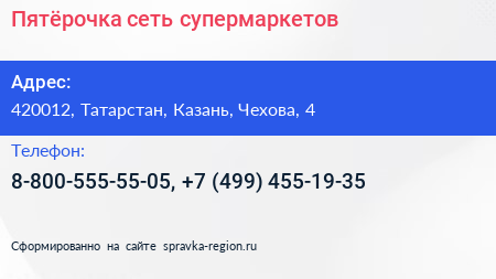 Пятёрочка, сеть супермаркетов по адресу 420012, Татарстан, Казань, Чехова, 4 в дальнейшем Организация, размещена в следующих категориях: