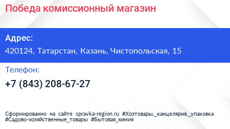Победа, комиссионный магазин по адресу 420124, Татарстан, Казань, Чистопольская, 15 в дальнейшем Организация, размещена в следующих категориях: