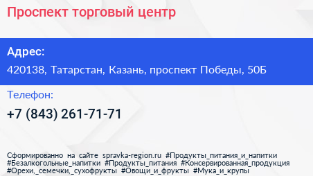 Проспект, торговый центр по адресу 420138, Татарстан, Казань, проспект Победы, 50Б в дальнейшем Организация, размещена в следующих категориях: