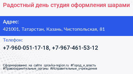 Радостный день, студия оформления шарами по адресу 421001, Татарстан, Казань, Чистопольская, 81 в дальнейшем Организация, размещена в следующих категориях: