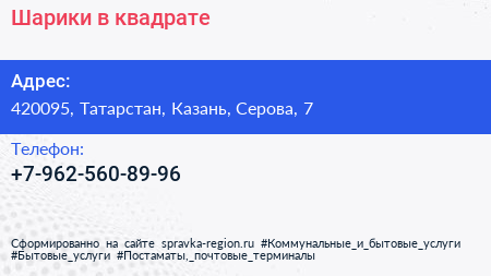 Шарики в квадрате по адресу 420095, Татарстан, Казань, Серова, 7 в дальнейшем Организация, размещена в следующих категориях: