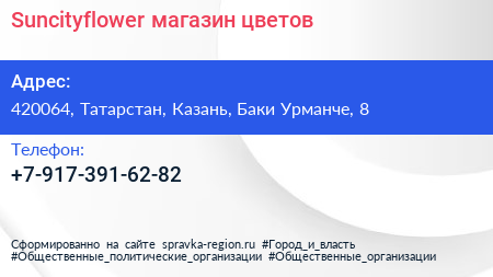 Suncityflower, магазин цветов по адресу 420064, Татарстан, Казань, Баки Урманче, 8 в дальнейшем Организация, размещена в следующих категориях: