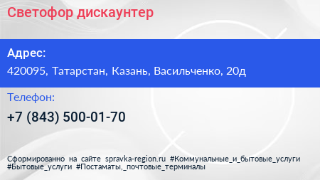 Светофор, дискаунтер по адресу 420095, Татарстан, Казань, Васильченко, 20д в дальнейшем Организация, размещена в следующих категориях: