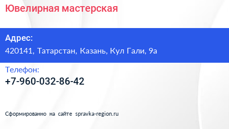 Ювелирная мастерская по адресу 420141, Татарстан, Казань, Кул Гали, 9а в дальнейшем Организация, размещена в следующих категориях: