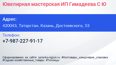 Ювелирная мастерская, ИП Гимадеева С.Ю. по адресу 420043, Татарстан, Казань, Достоевского, 53 в дальнейшем Организация, размещена в следующих категориях:
