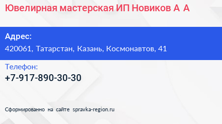 Ювелирная мастерская, ИП Новиков А.А. по адресу 420061, Татарстан, Казань, Космонавтов, 41 в дальнейшем Организация, размещена в следующих категориях: