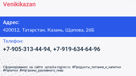 Venikikazan по адресу 420012, Татарстан, Казань, Щапова, 26Б в дальнейшем Организация, размещена в следующих категориях:
