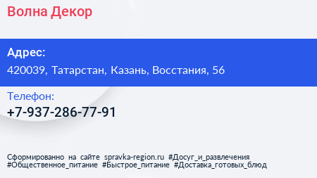Волна-Декор по адресу 420039, Татарстан, Казань, Восстания, 56 в дальнейшем Организация, размещена в следующих категориях: