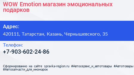 WOW-Emotion, магазин эмоциональных подарков по адресу 420111, Татарстан, Казань, Чернышевского, 35 в дальнейшем Организация, размещена в следующих категориях: