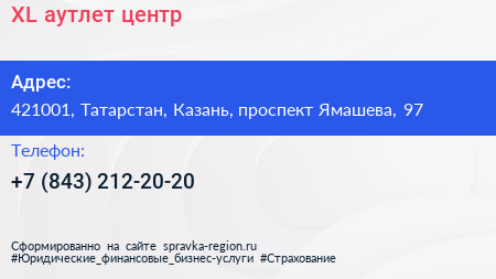 XL, аутлет-центр по адресу 421001, Татарстан, Казань, проспект Ямашева, 97 в дальнейшем Организация, размещена в следующих категориях: