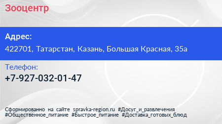 Зооцентр по адресу 422701, Татарстан, Казань, Большая Красная, 35а в дальнейшем Организация, размещена в следующих категориях: