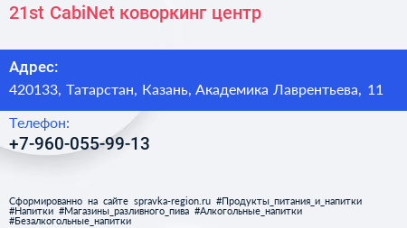21st CabiNet, коворкинг-центр по адресу 420133, Татарстан, Казань, Академика Лаврентьева, 11 в дальнейшем Организация, размещена в следующих категориях: