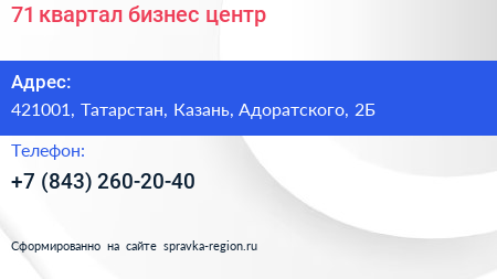 71 квартал, бизнес-центр по адресу 421001, Татарстан, Казань, Адоратского, 2Б в дальнейшем Организация, размещена в следующих категориях: