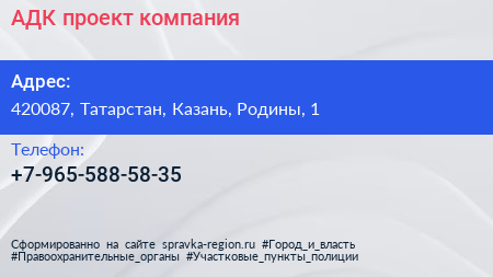 АДК проект, компания по адресу 420087, Татарстан, Казань, Родины, 1 в дальнейшем Организация, размещена в следующих категориях: