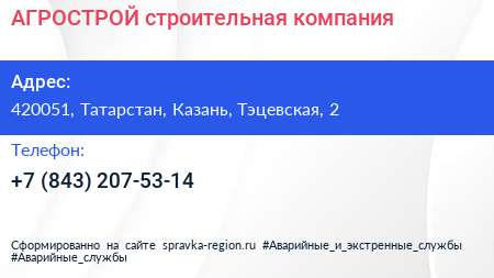 АГРОСТРОЙ, строительная компания по адресу 420051, Татарстан, Казань, Тэцевская, 2 в дальнейшем Организация, размещена в следующих категориях: