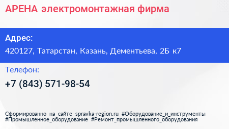 АРЕНА, электромонтажная фирма по адресу 420127, Татарстан, Казань, Дементьева, 2Б к7 в дальнейшем Организация, размещена в следующих категориях: