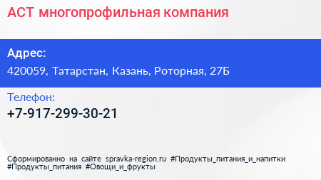 АСТ, многопрофильная компания по адресу 420059, Татарстан, Казань, Роторная, 27Б в дальнейшем Организация, размещена в следующих категориях: