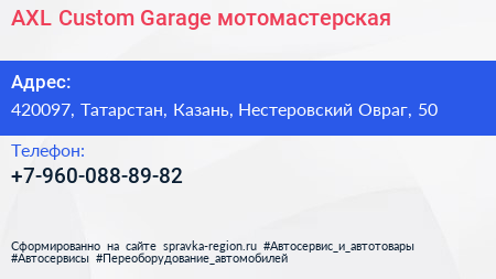 AXL Custom Garage, мотомастерская по адресу 420097, Татарстан, Казань, Нестеровский Овраг, 50 в дальнейшем Организация, размещена в следующих категориях: