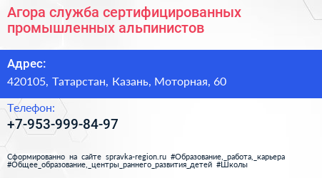 Агора, служба сертифицированных промышленных альпинистов по адресу 420105, Татарстан, Казань, Моторная, 60 в дальнейшем Организация, размещена в следующих категориях: